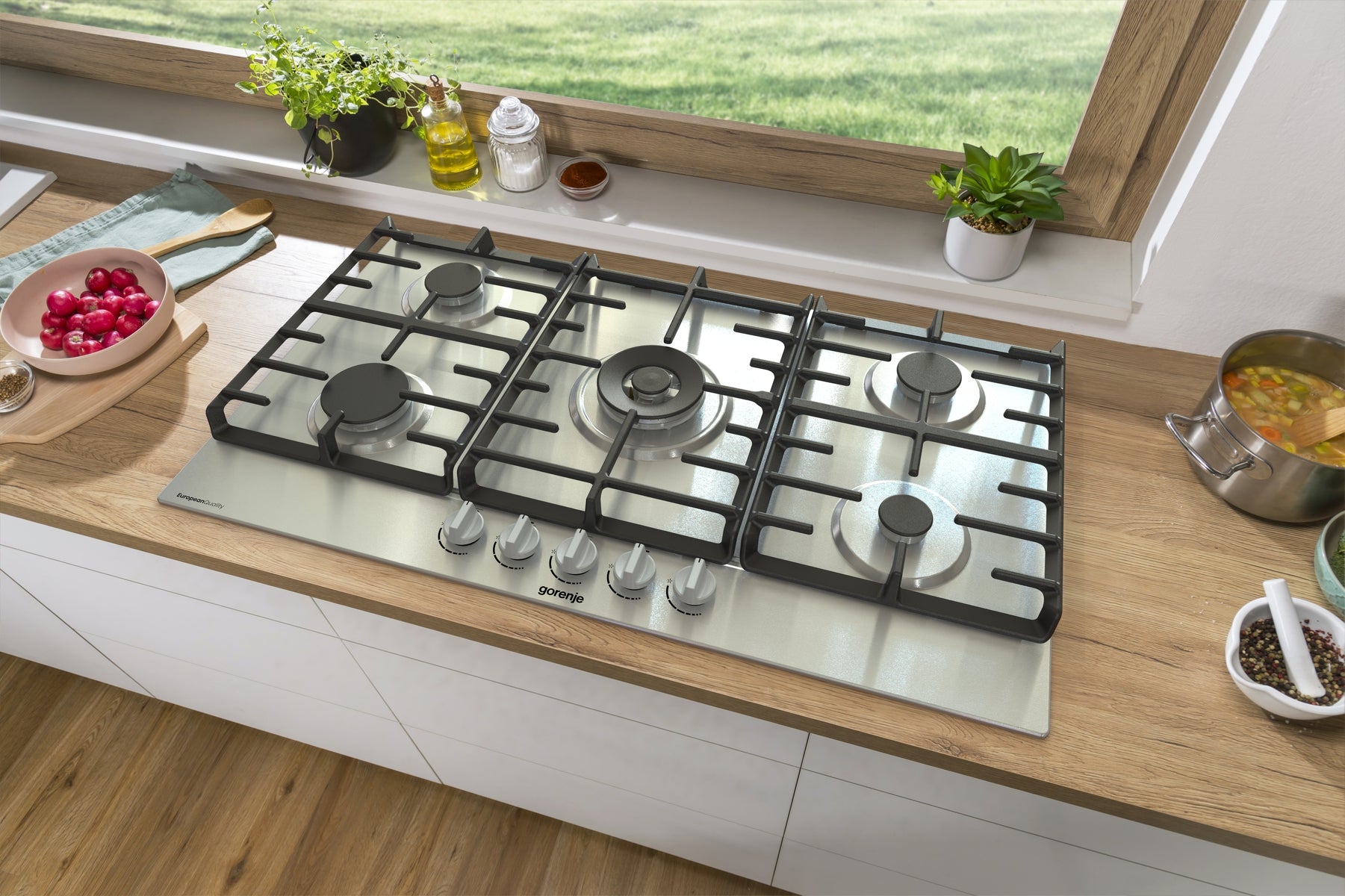 Gas hob, 90 cm, stainless steel, 5 burners, front controls, comforting handles, double burner in the middle, cast iron support.